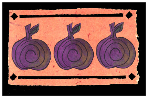 purple apples: 14"w X 7"h: pastel, handmade paper, paint, wood: SOLD