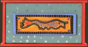 orange fish: 7.25"w X 3.5"h: 'A' side to 'antigua' - foil, paint, pastel, wood, beads