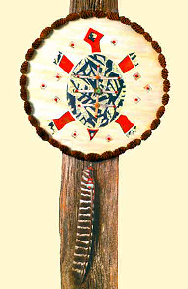 turtle wheel: 7'h X 14''w: oil pastel, paper, paint, beads, nails, birch bark, feathers on plywood & barnboard: SOLD