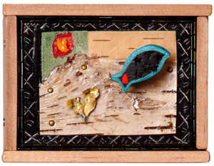 tiny fish: 'B' side of 'cardinal': paint, bark, lichen, beads, pastel
