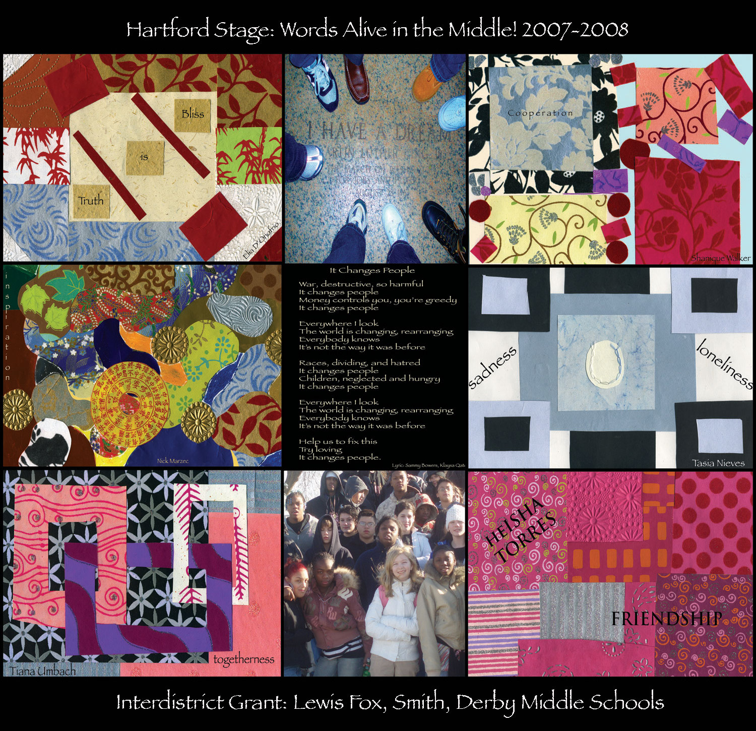 Hartford Stage: “Words Alive in the Middle!” Created multimedia arts residency based on The Diary of Anne Frank. This interdistrict grant joined Lewis Fox, Derby and Smith Middle Schools. Students created CDs, DVDs and art based on themes derived from study of the Holocaust: struggle, joy, courage, trust, triumph, despair, hope, tolerance, love. They journeyed together to Washington, DC, and performed at the culmination ceremony, which included their own film, photos, artwork, writing and soundtracks, at Hartford Stage, Spring, 2008. Student collage Joy, created in my multimedia class, was exhibited in Hartford’s contribution to the international “Exhibition Coexistence” project, funded (in Hartford) by The Hartford Financial Services Group.