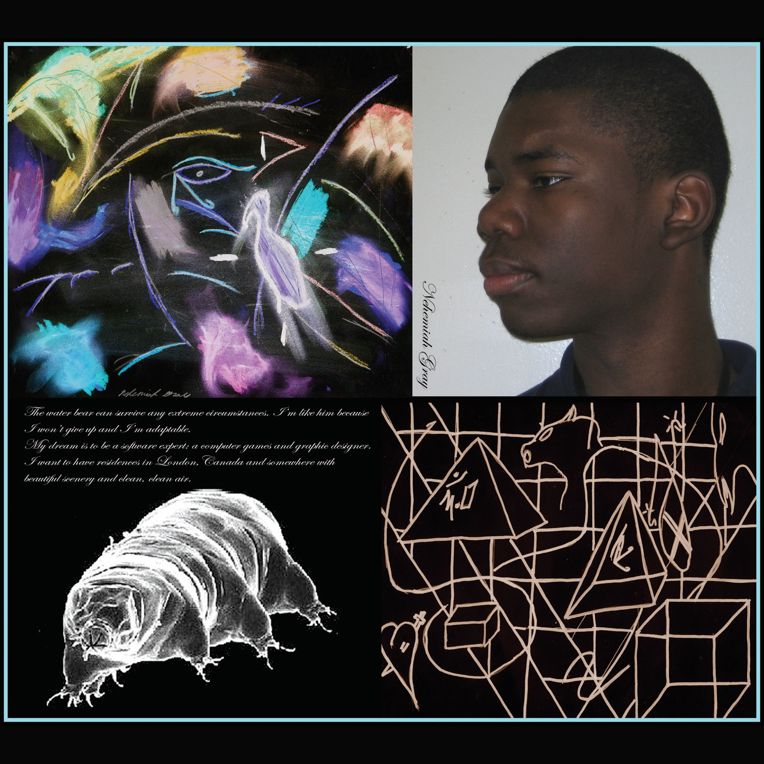 Multimedia Arts and Technology Residency: Students use Apple technology/software (Garage Band, Adobe Photoshop), and fundamental art tools/supplies to create: soundtracks/songs, animation, video, photography, eBooks, fine art, creative writing, large-scale photo-collage prints.